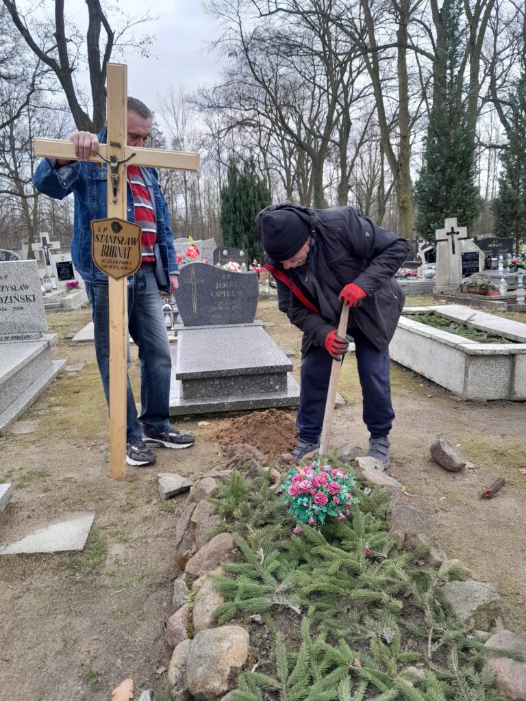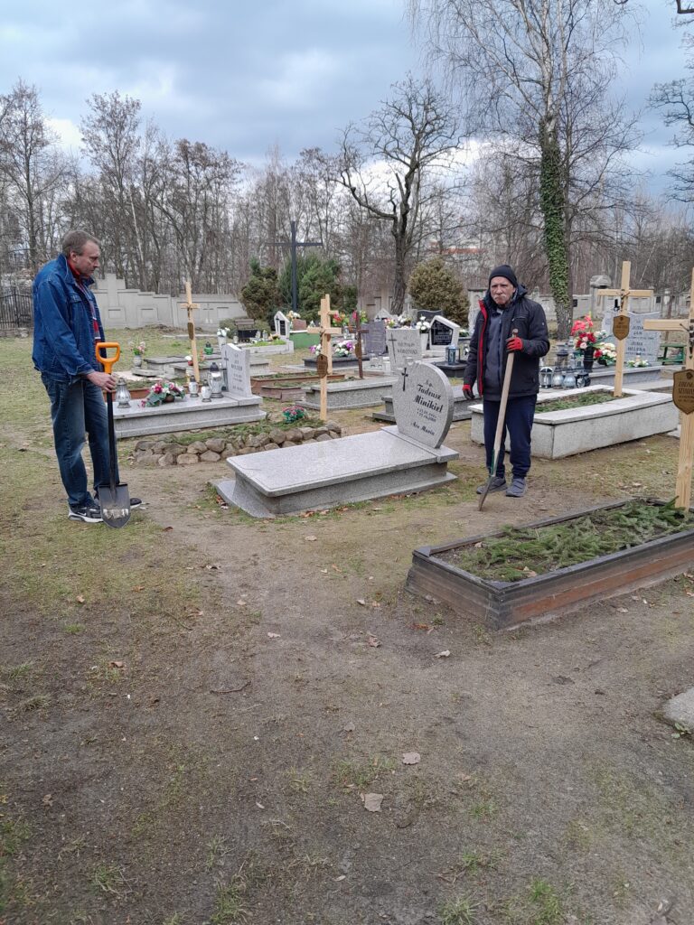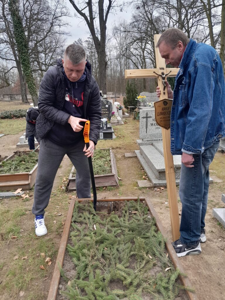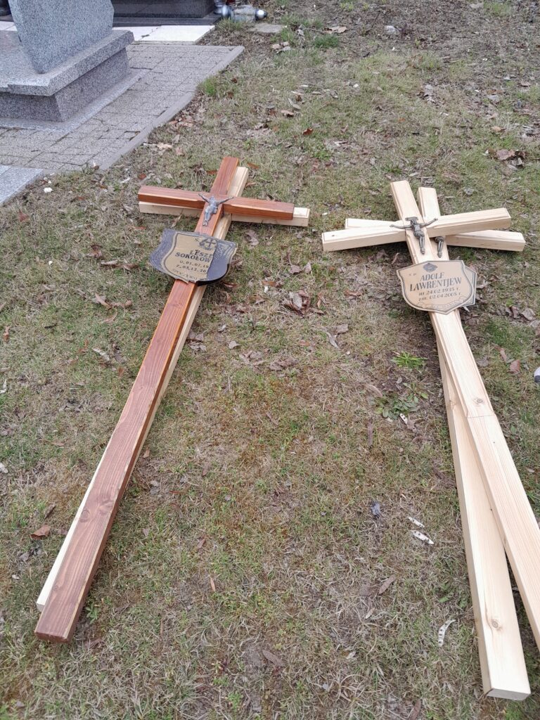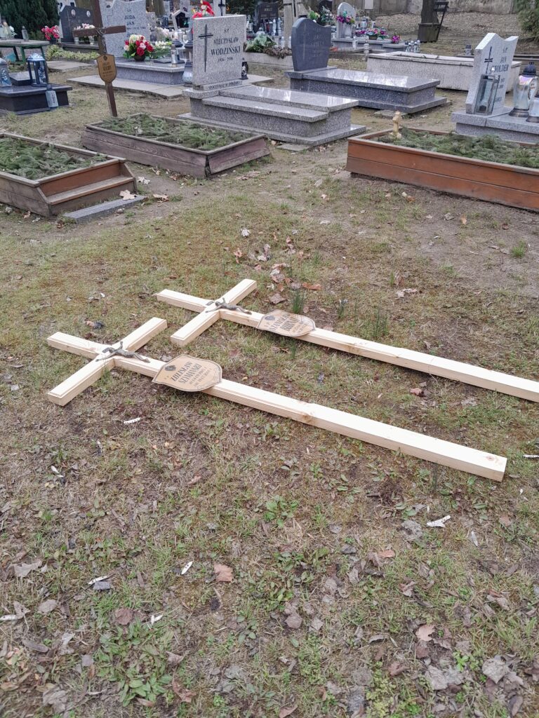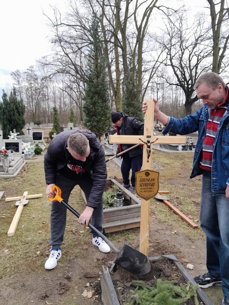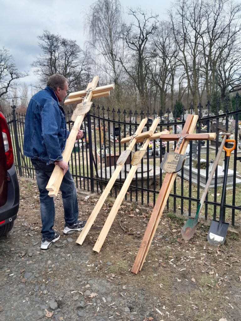 Drewniane krzyże zostały wykonane w warsztacie stolarskim przez wolontariuszy ze Schroniska w Zielonej Górze, natomiast mieszkańcy Schroniska Caritas w Żukowicach zajęli się ich montażem oraz uporządkowaniem terenu wokół grobów. Działania te stanowią kontynuację cyklicznej opieki nad miejscami pamięci.