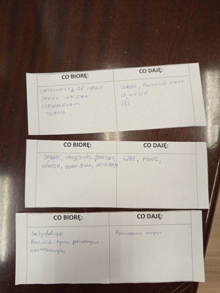 Podczas zajęć rozmawialiśmy o tym, czym jest wolontariat, jakie daje korzyści i dlaczego warto angażować się w działania społeczne. Uczestnicy mieli okazję podzielić się swoimi doświadczeniami, omówić motywacje do pomagania innym oraz zastanowić się, jakie umiejętności mogą rozwijać poprzez wolontariat.