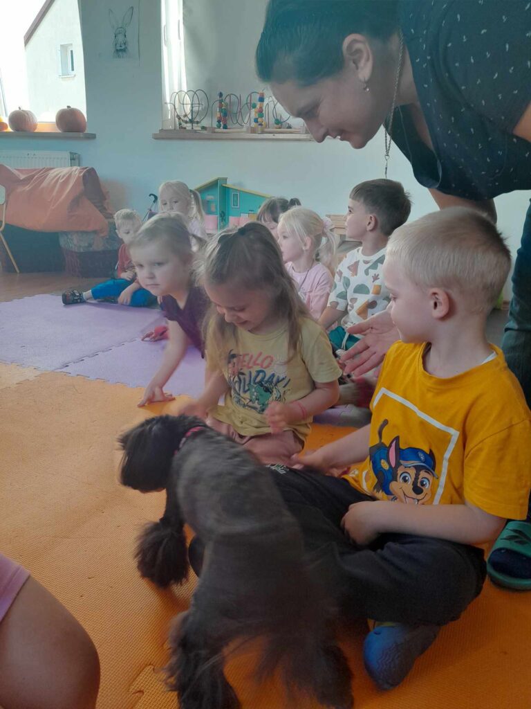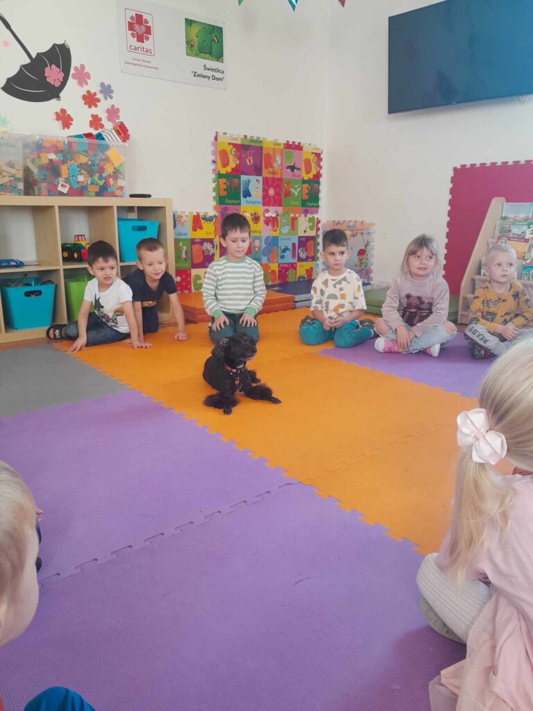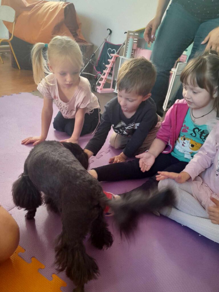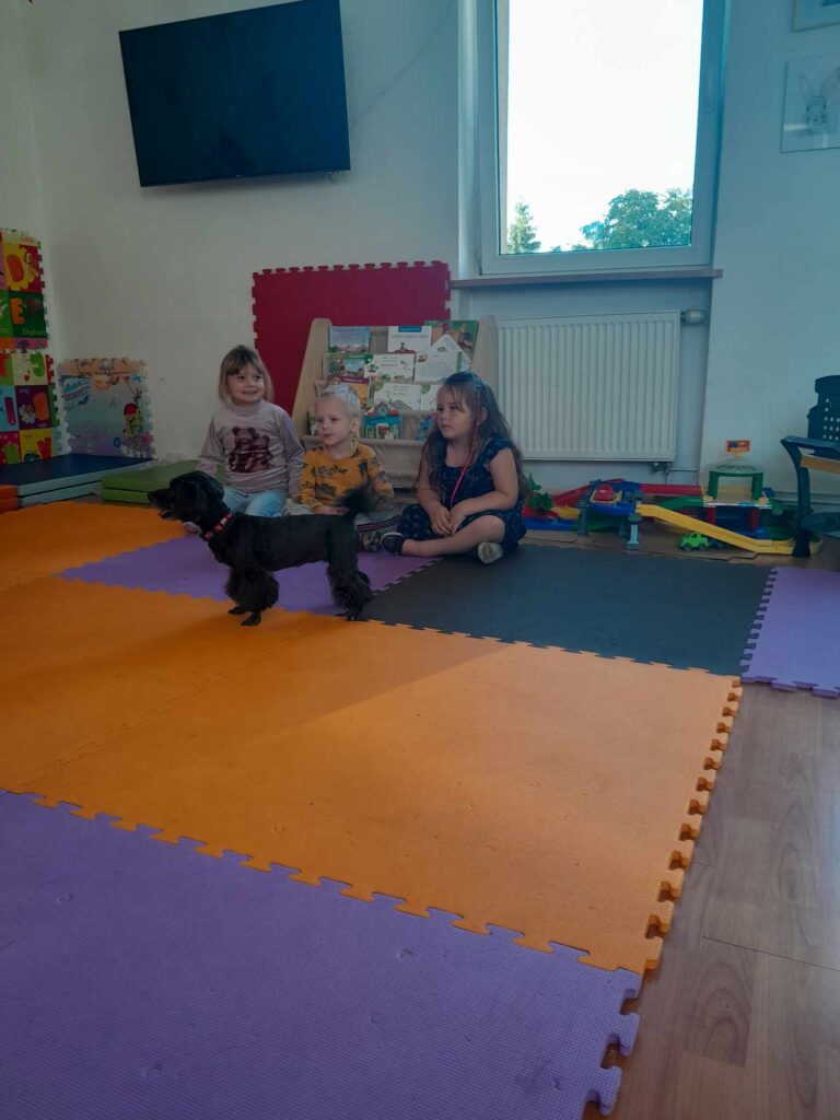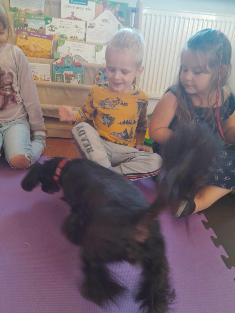 Gościliśmy w ramach dogoterapii pieska Lunkę, która uszczęśliwiła nasze  dzieci dając im dużo radości i uśmiechu. Była również pizza a każdy chłopiec otrzymał prezent od dziewczynek
