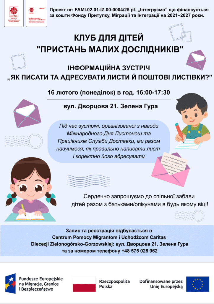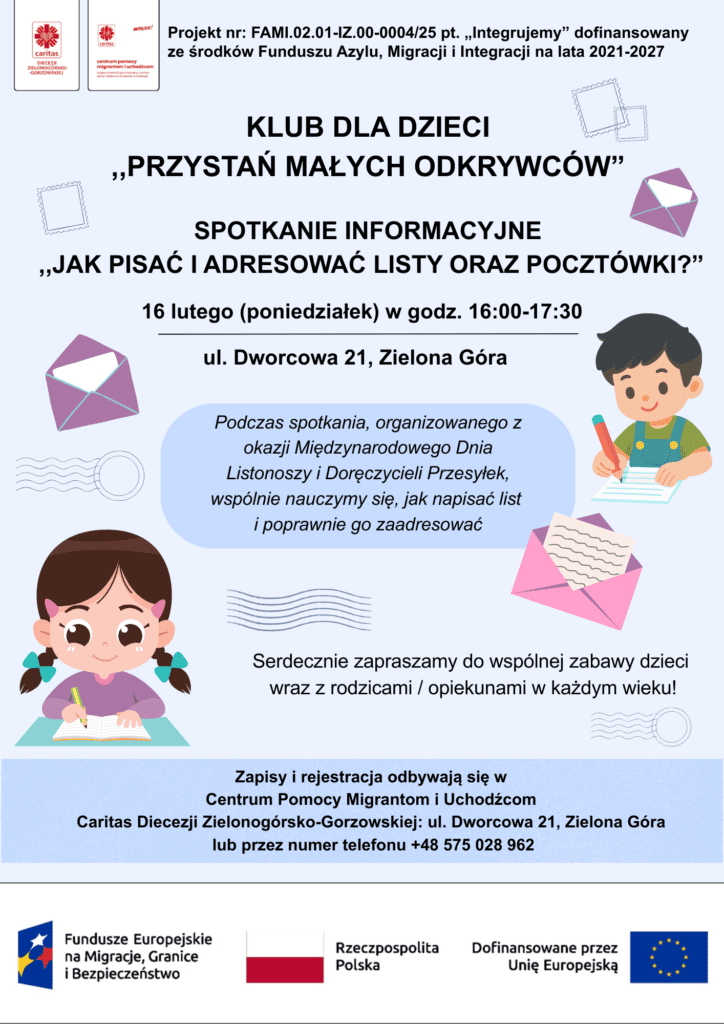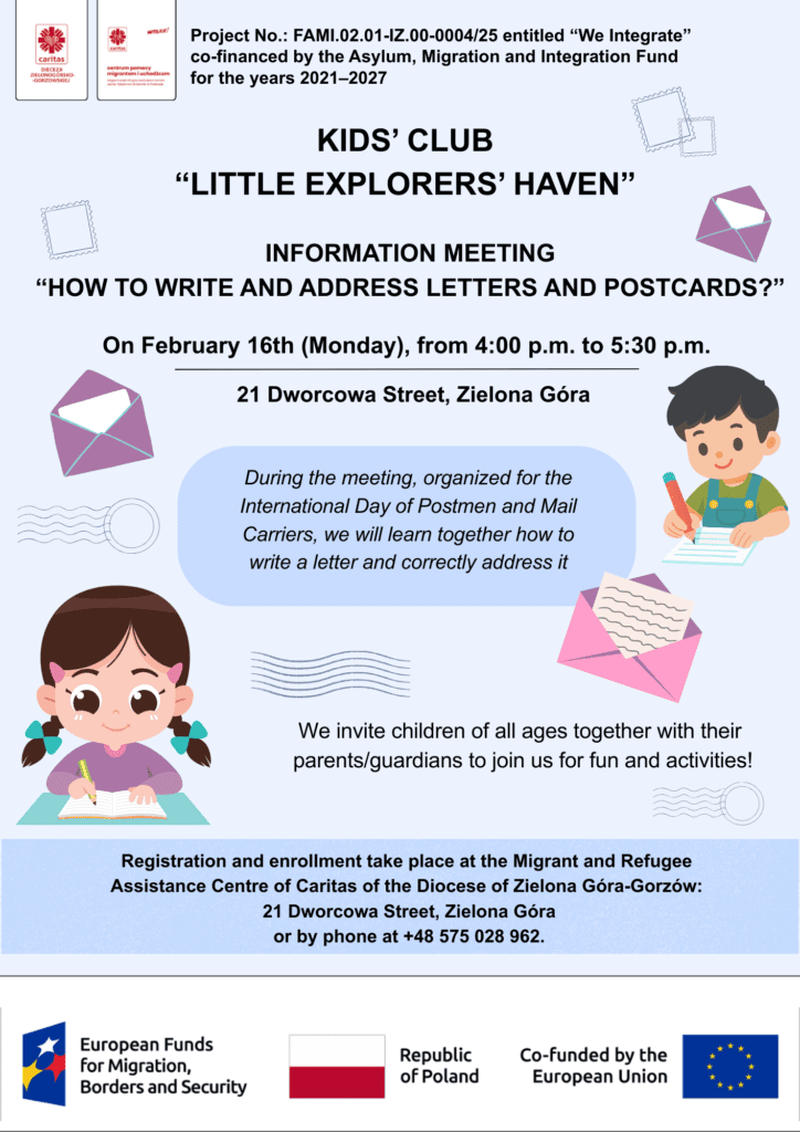 During the meeting, organized for the International Day of Postmen and Mail Carriers, we will learn together how to write a letter and correctly address it. Registration and enrollment take place at the Migrant and Refugee Assistance Centre of Caritas of the Diocese of Zielona Góra-Gorzów: 21 Dworcowa Street, Zielona Góra or by phone at +48 575 028 962.