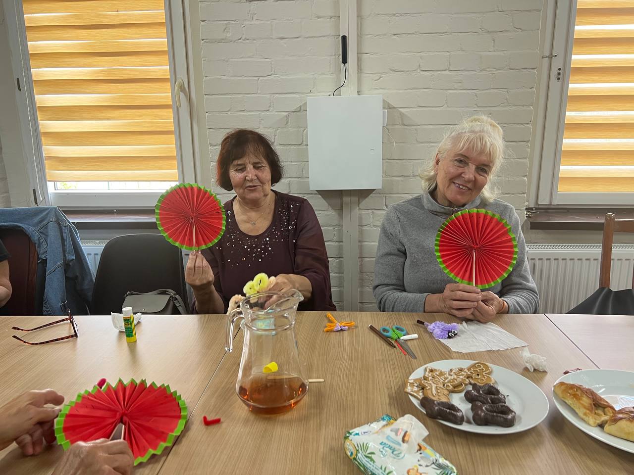 Podczas jednego z letnich spotkań odbyły się warsztaty rękodzielnicze, w czasie których uczestniczki wykonały barwne ważki z drucików kreatywnych oraz papierowe arbuzy na drewnianych patyczkach. Gotowe prace nie tylko cieszyły oko, ale również pełniły praktyczną funkcję – arbuzowe wachlarze okazały się doskonałe na gorące, letnie dni.