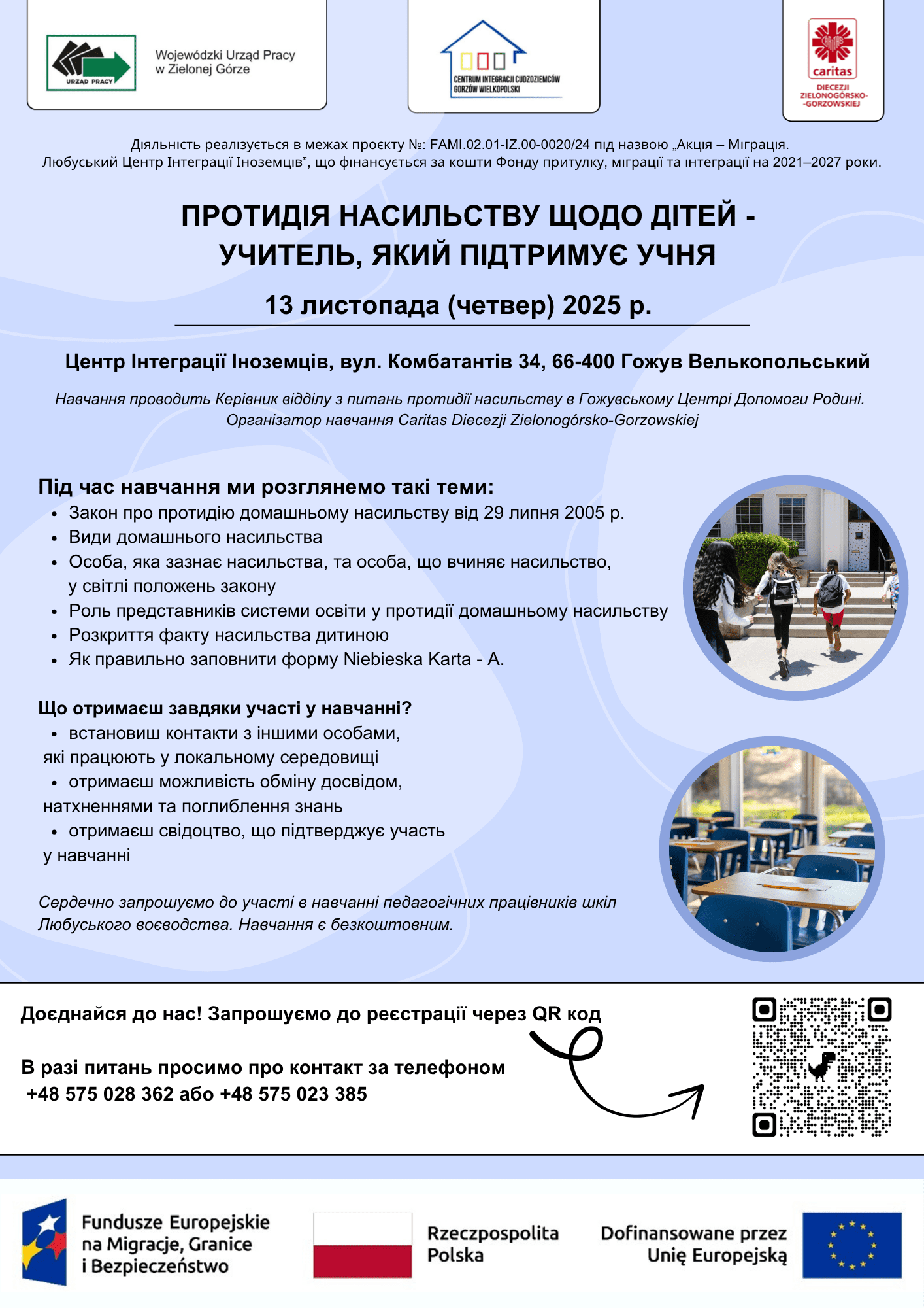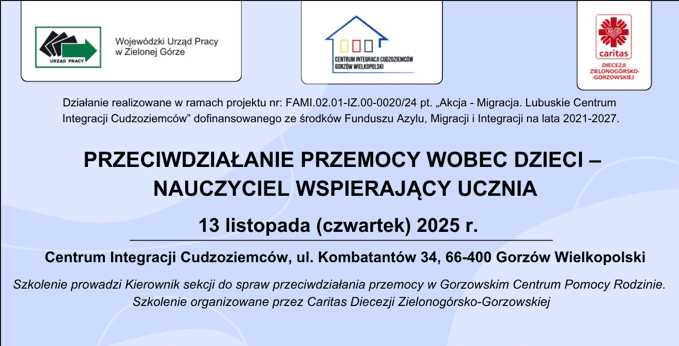 Serdecznie zapraszamy na szkolenie, które odbędzie się 13 listopada 2025 r. w Centrum Integracji Cudzoziemców, ul. Kombatantów 34, 66-400 Gorzów Wielkopolski. Szkolenie prowadzi Kierownik sekcji do spraw przeciwdziałania przemocy w Gorzowskim Centrum Pomocy Rodzinie.