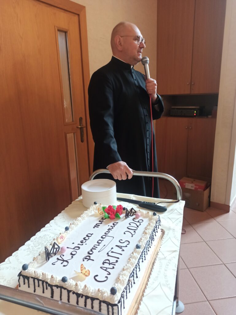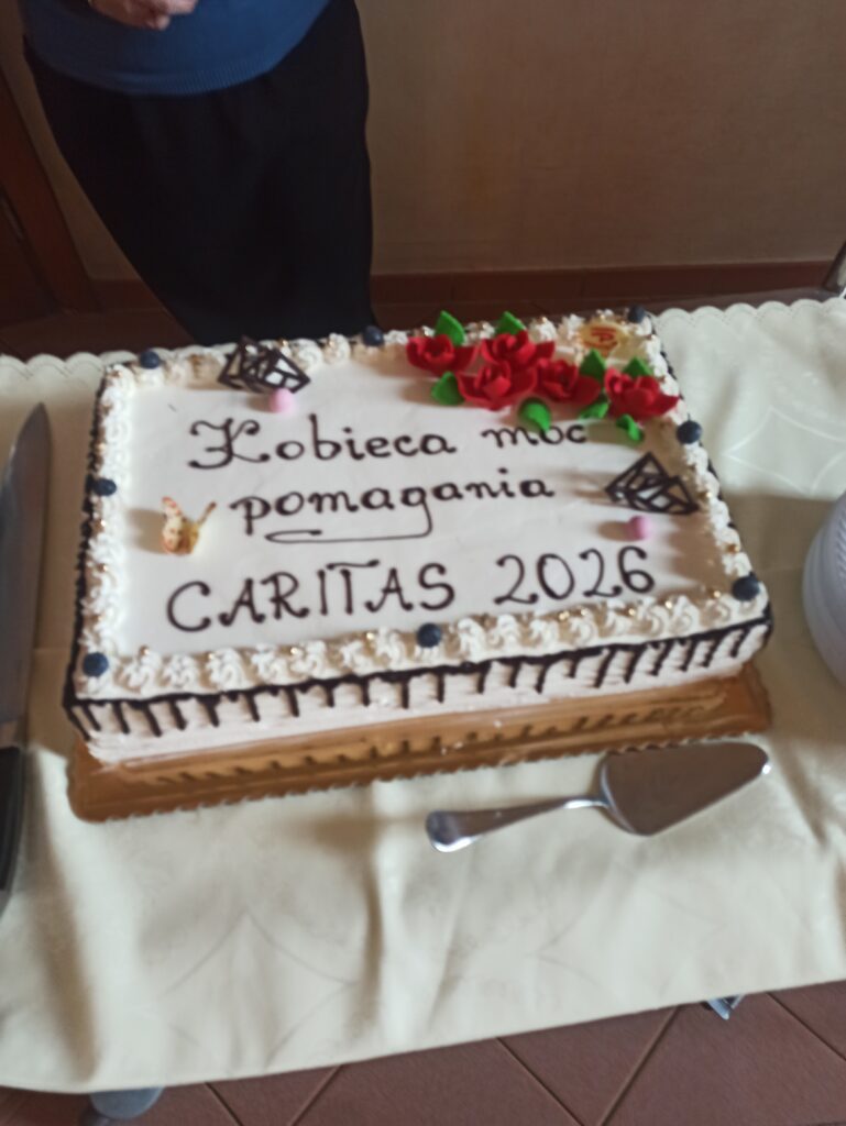 W niedzielę 8 marca ks. Dyrektor przygotował dla wolontariuszy miłą niespodziankę z okazji Dnia Kobiet. Odbyło się spotkanie przy kawie, pojawiły się piękne torty z napisem „Kobieca moc pomagania – Caritas 2026”, a wszystkie panie otrzymały słodki upominek.