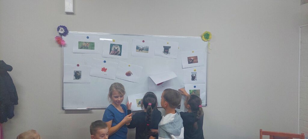 Podczas zajęć z języka angielskiego dzieci poznały nowe słownictwo związane z jesienią – m.in. dotyczące zwierząt, potraw i rzeczy. Wiedza była przekazywana w sposób przystępny, a nauka przebiegała w miłej atmosferze – zwłaszcza, że dzieci uczyły się słówek poprzez gry i zabawy.