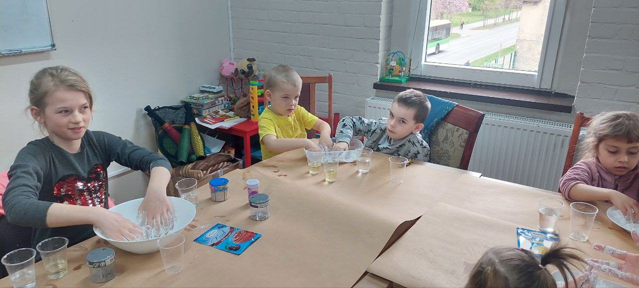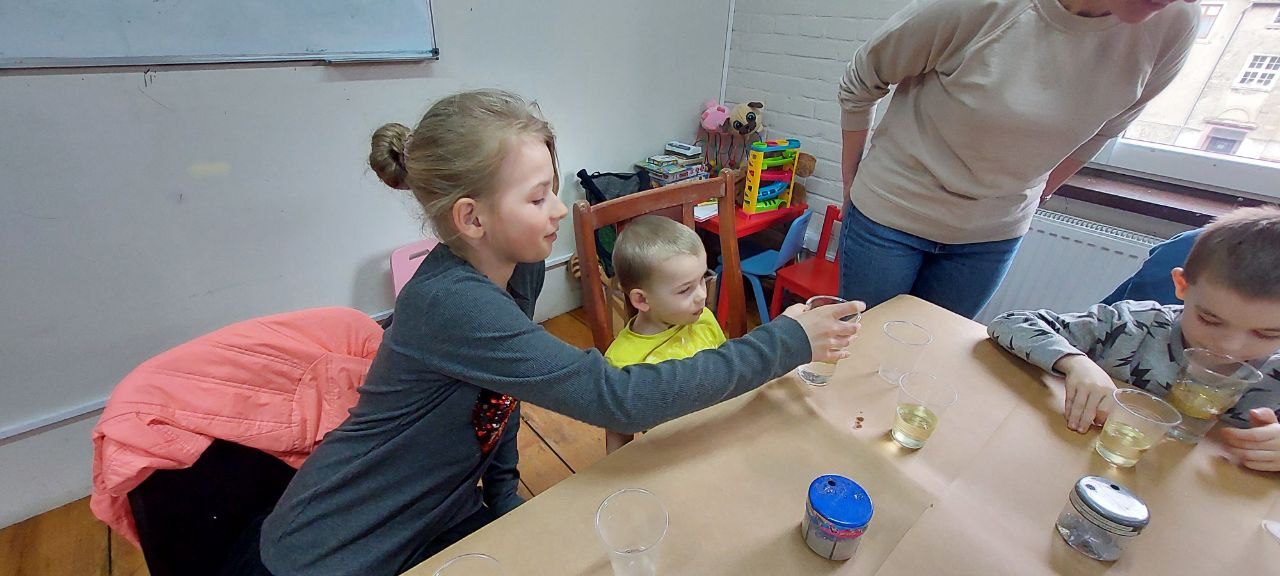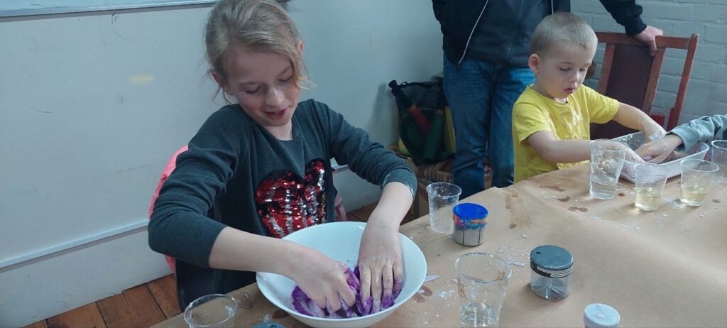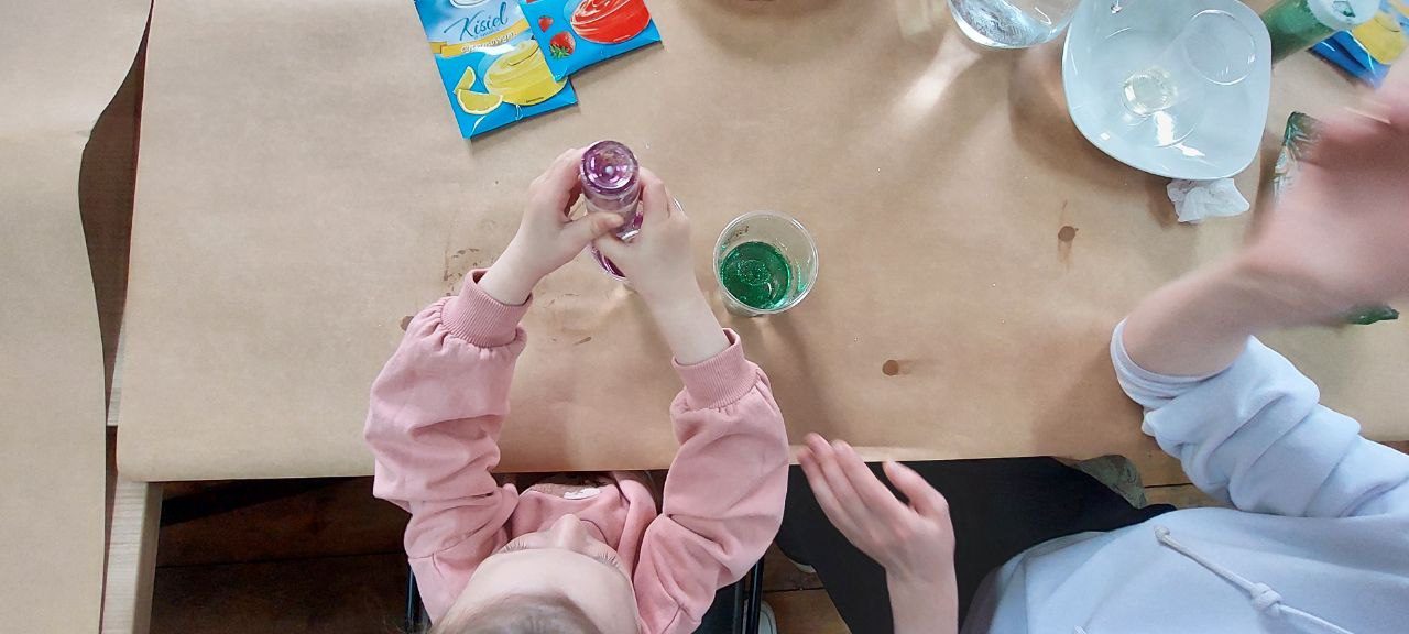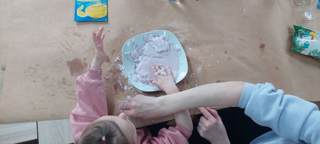 Tematem naszych zajęć była sensoplastyka – czyli jak zaangażować wszystkie zmysły naraz. Ze składników, które znajdziemy w każdej kuchni (skrobia, kisiel, woda, olej) oraz kolorowego brokatu zrobiliśmy eksperyment pokazujący czym jest ciecz nienewtonowska oraz jak możemy badać gęstość cieczy w różnych kombinacjach.