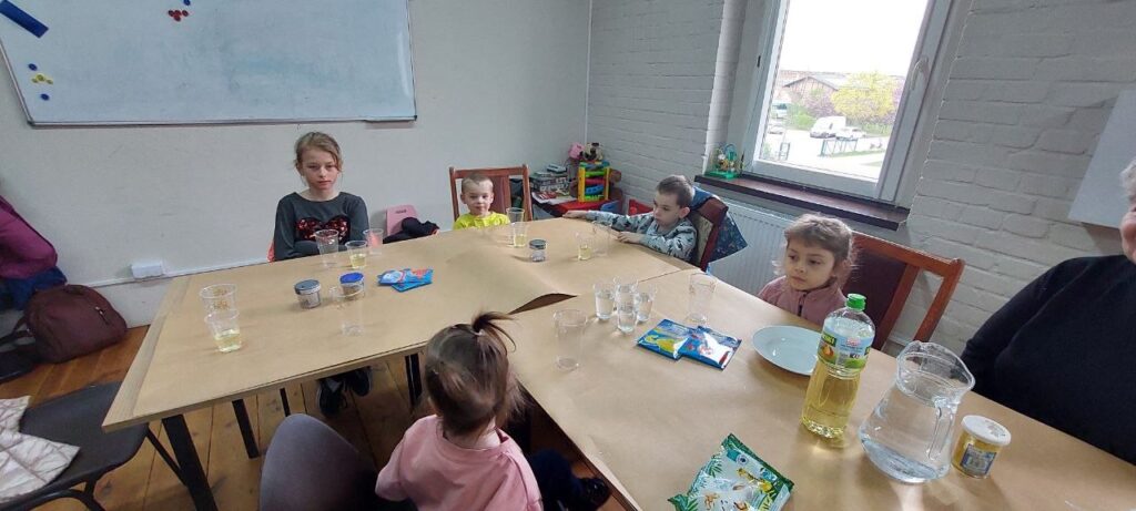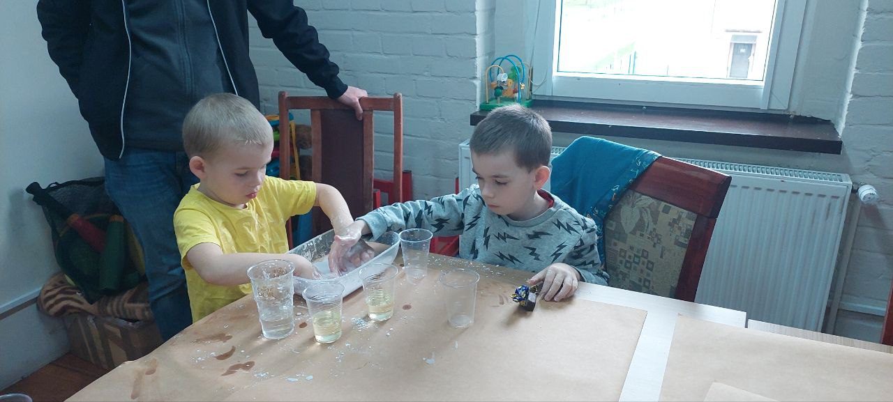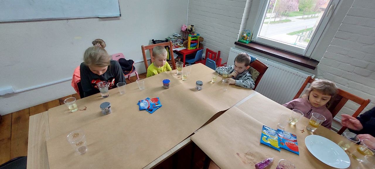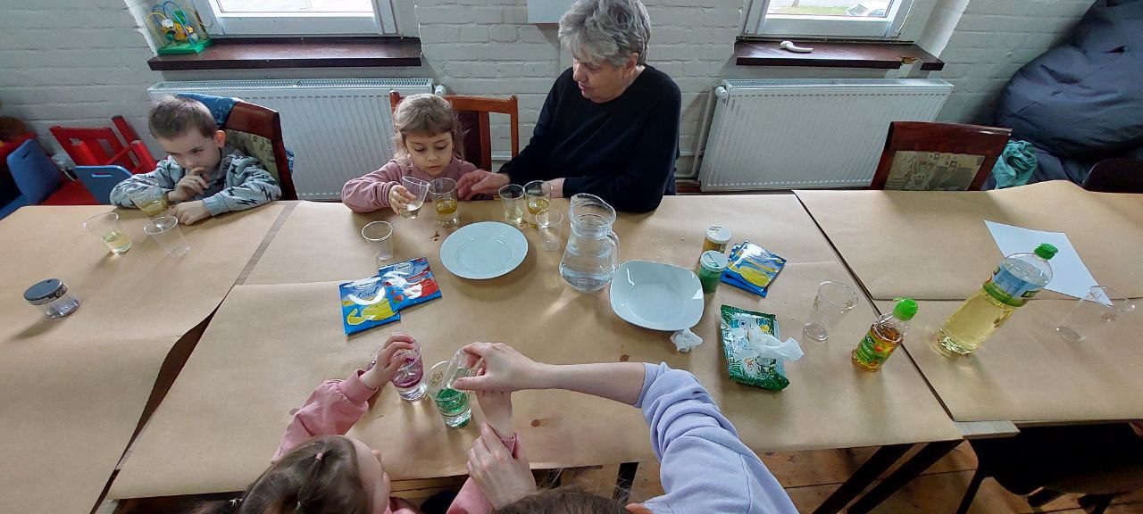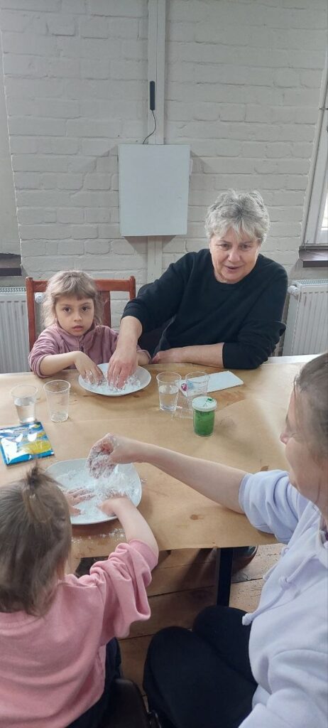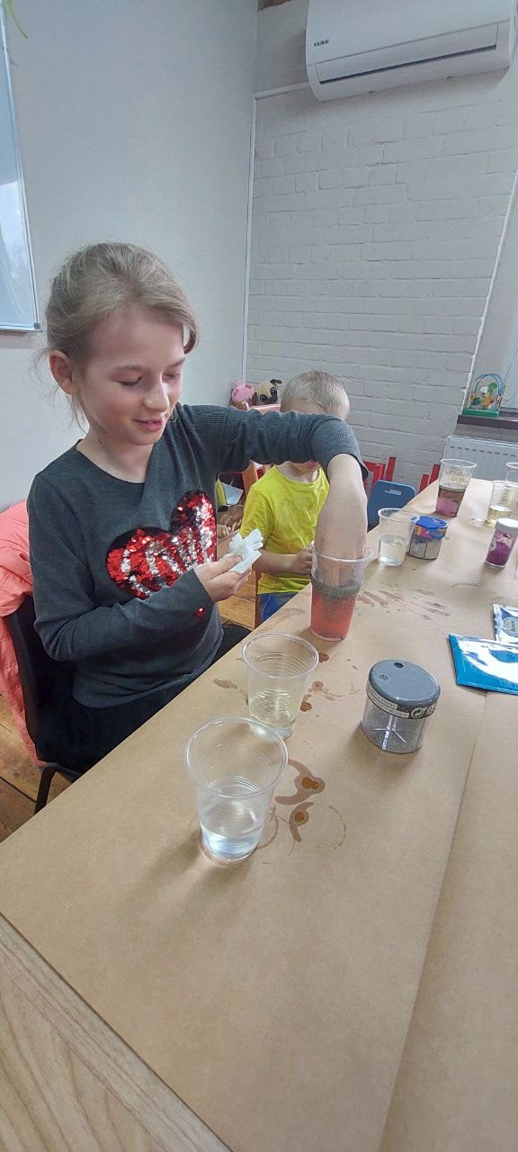 Tematem naszych zajęć była sensoplastyka – czyli jak zaangażować wszystkie zmysły naraz. Ze składników, które znajdziemy w każdej kuchni (skrobia, kisiel, woda, olej) oraz kolorowego brokatu zrobiliśmy eksperyment pokazujący czym jest ciecz nienewtonowska oraz jak możemy badać gęstość cieczy w różnych kombinacjach.