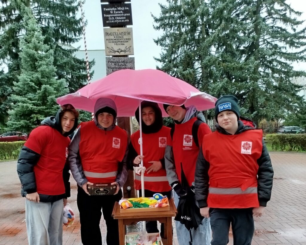 Wolontariusze że Szkolnego Koła Caritas ze Szkoły Podstawowej nr 8 w Żarach zorganizowali kiermasz charytatywny w parafii Wniebowzięcia NMP. Uczniowie sprzedawali własnoręcznie wykonane bombki, ozdoby filcowe, bransoletki i torby z materiału. Zgromadzone fundusze zostaną przekazane na pomoc powodzianom z okolic Lądka Zdroju. Łącznie zebrano 990 zł.