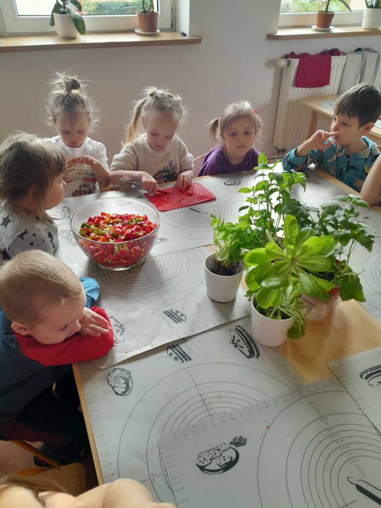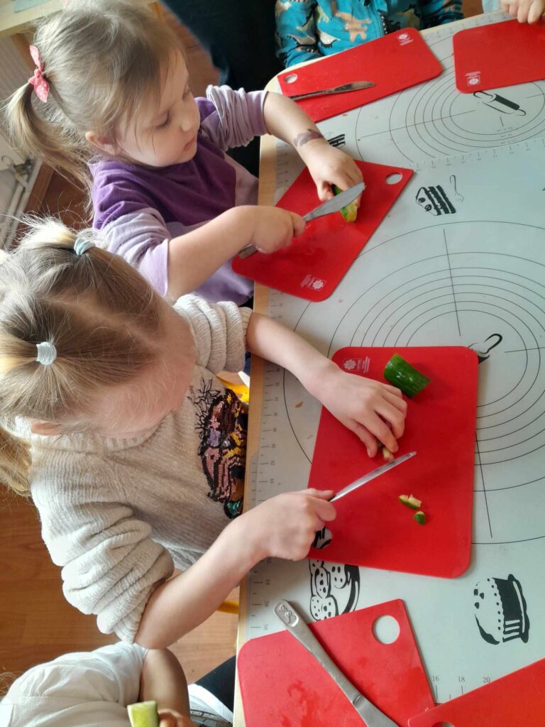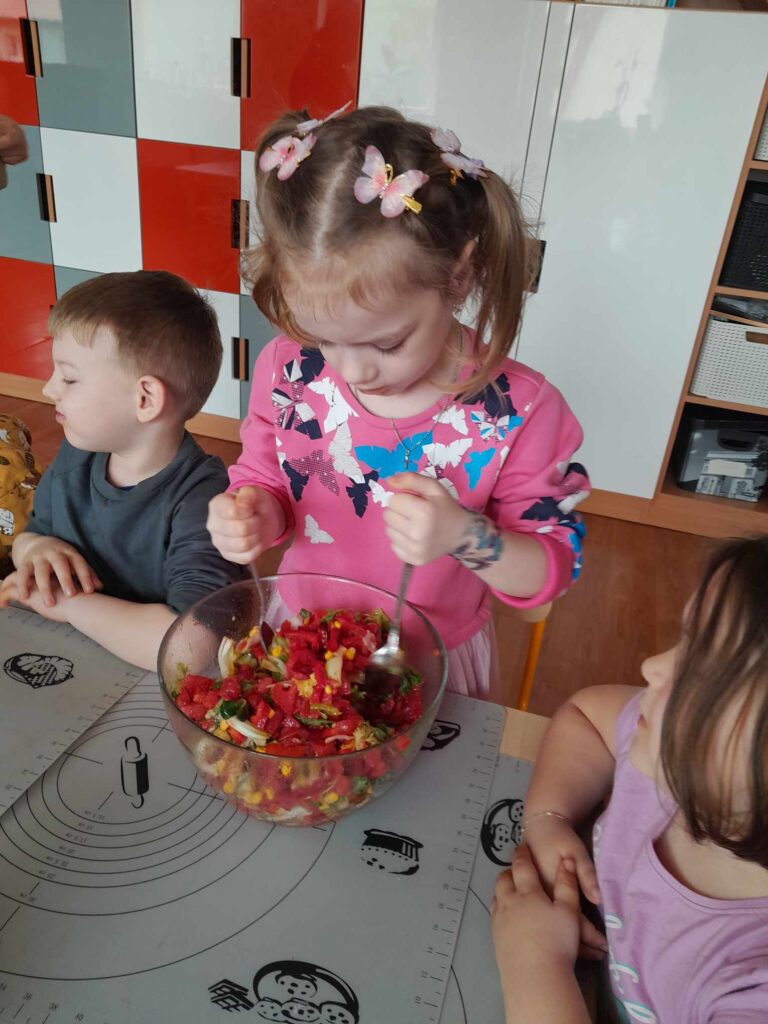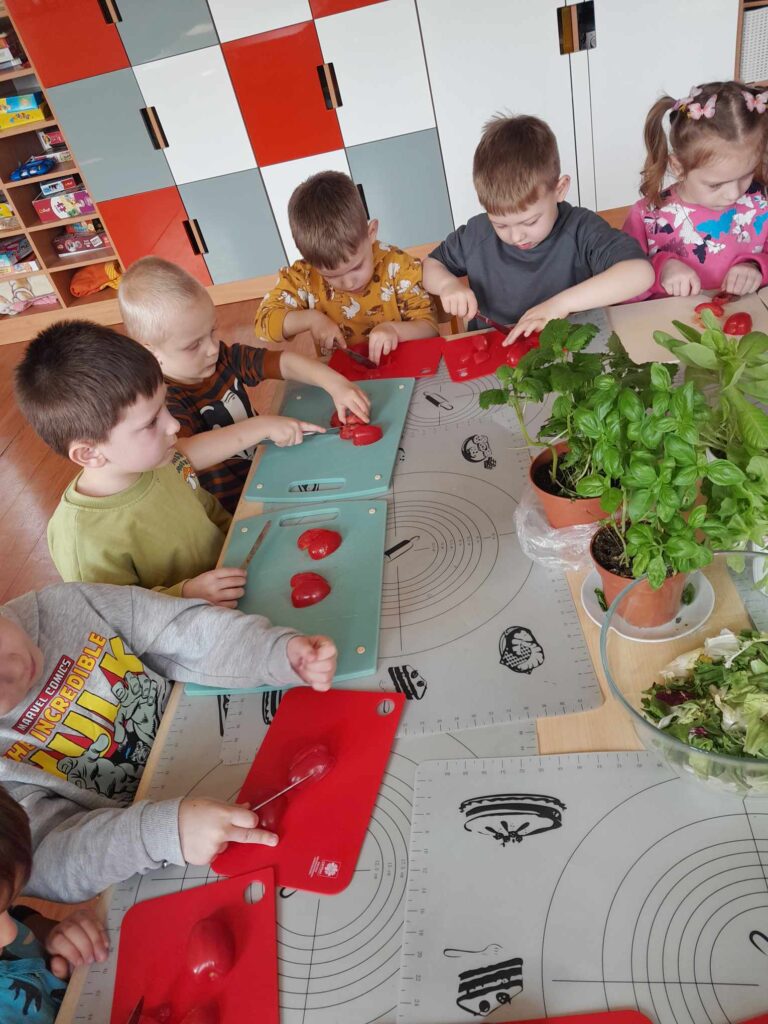 Dzieci biorą udział w warsztatach na temat zasad prawidłowego odżywiania, umiejętności przygotowywania potraw, poznawania zdrowych produktów i prawidłowym zachowaniu przy stole, wspólnym gotowaniu.