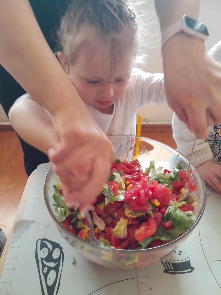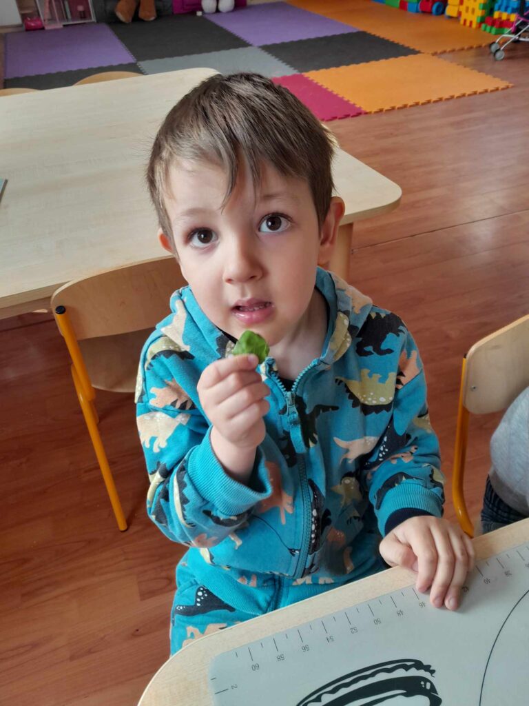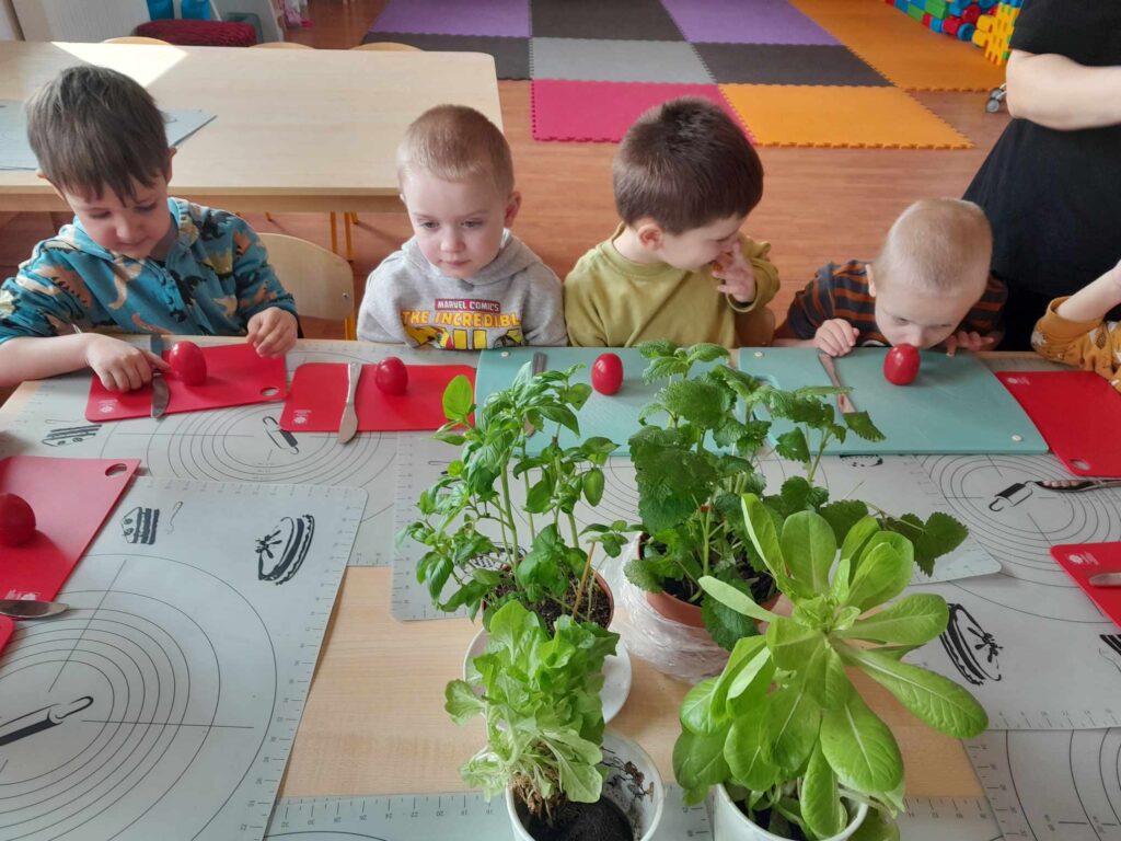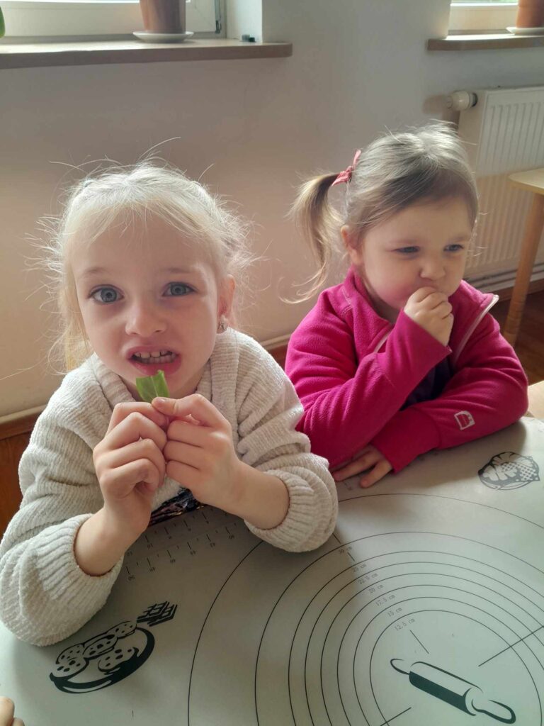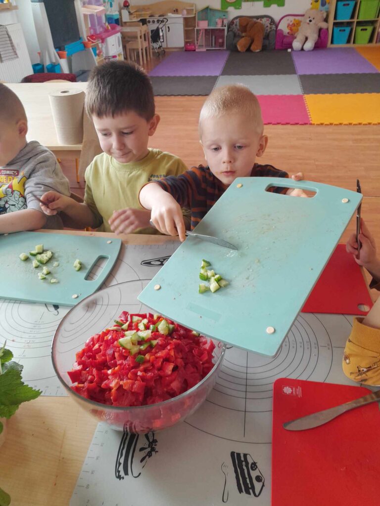 Dzieci biorą udział w warsztatach na temat zasad prawidłowego odżywiania, umiejętności przygotowywania potraw, poznawania zdrowych produktów i prawidłowym zachowaniu przy stole, wspólnym gotowaniu.